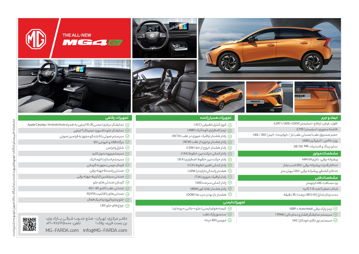 ثبت درخواست برای ثبتنام خودروی MG 4 EV در اتوخسروانی با شرایط ویژه فروش و پیشفروش آغاز شده و برای متقاضیان خودروهای برقی، فرصتی مناسب برای ورود به دنیای حملونقل پاک فراهم کرده است. اگر علاقهمند به خرید MG هستید، این محصول یک انتخاب جذاب میتواند برای شما باشد.